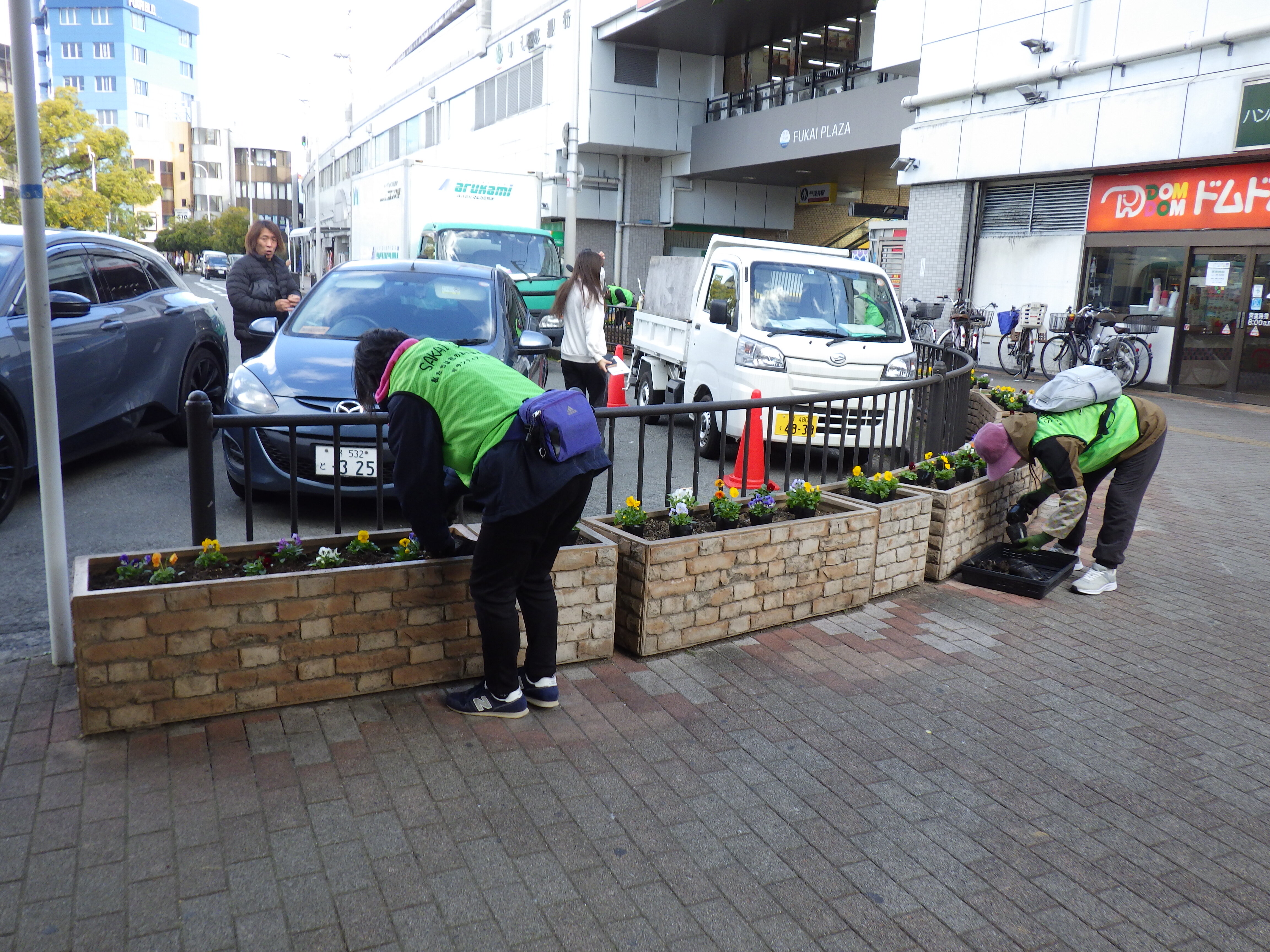 南海泉北線「深井駅前」のフラワーポットを、中区まちづくり咲ークル 「花輪」の皆さまのご協力で花植え活動を行いました。